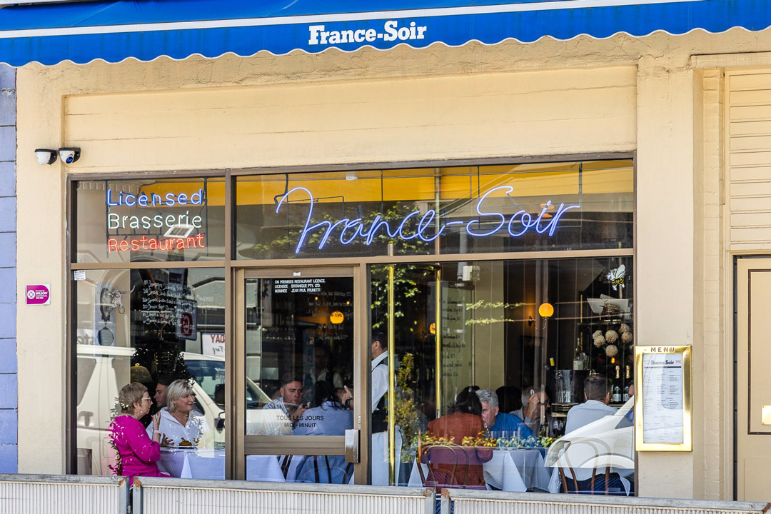 FranceSoir storefront with a blue awning and neon signage reading France-Soir, Licensed Brasserie Restaurant, visible through glass windows showing diners at white-tablecloth tables.